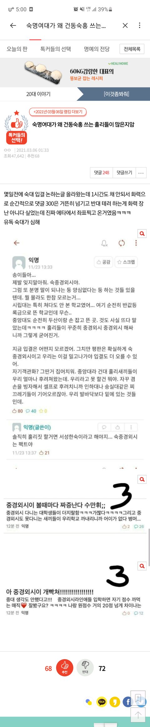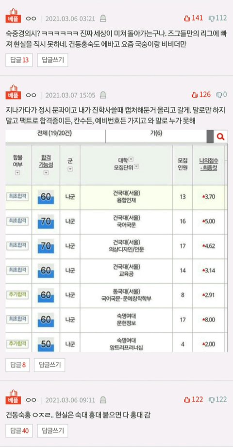 1. 상황설명 "숙명여대가 왜 건동홍숙을 쓰는 훌리들이 많은지 암" (앎) 이라는 글의 글쓴이가 글을 올리고 (본문의 첫번째 사진) 건동홍 등에 붙고도 숙대에 온 많은 인증사진이 댓글로 올라오자 원글을 삭제