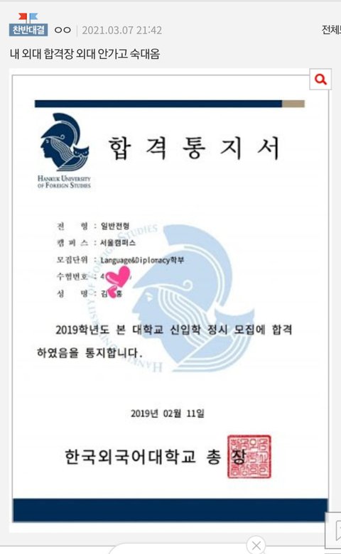 위의 반수 인증글은 외대 소수어과 -> 숙대 공대라는 것이 확인 되었으며