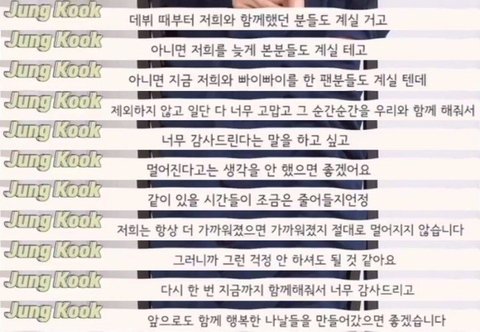 트위터 보다가 뜬 건데 떠난 팬 마저 생각해주는 거 보니까 뭔가 기분이 묘 했음.. 서로 같이 있는 시간이 줄어들지언정 가까워졌으면 가까워진거지 절대 멀어진게 아니래 난 타팬인데 우리 본진도 이런 생각을 할까 싶기도 하고 쨋든 정국 인성은 진짜 좋은 듯