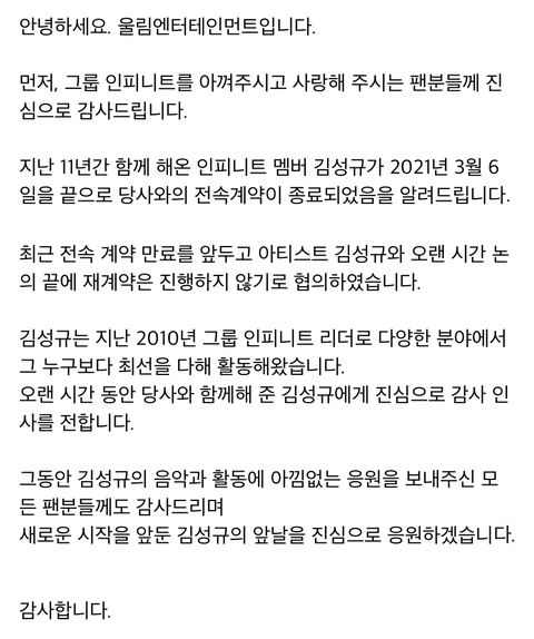성규는 울림과 3월 6일자로 계약이 종료 됐다고 함