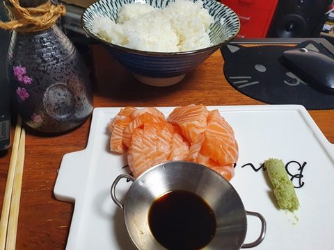 단촛물 밥에 고추냉이 얹고 연어따로 얹어서 간장에 찍어서... 맛은 있었지만 자괴감이ㅠㅠ