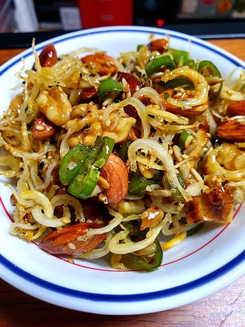 견과류멸치볶음인데, 배부를때 술안주로 최고입니다. 배부르면 먹질 말아야지...ㅠㅠ
