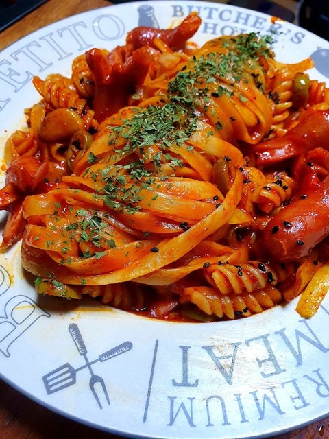 요건 나폴리탄인데 토마토소스와 고추장을 5:5로 섞어서 만듭니다. 약간 꾸덕하게... 밑에 깔려있는 스크럼블과 함께 먹으면 핵존맛!! 엄청 자주해먹는 파스타입니다ㅋㅋ