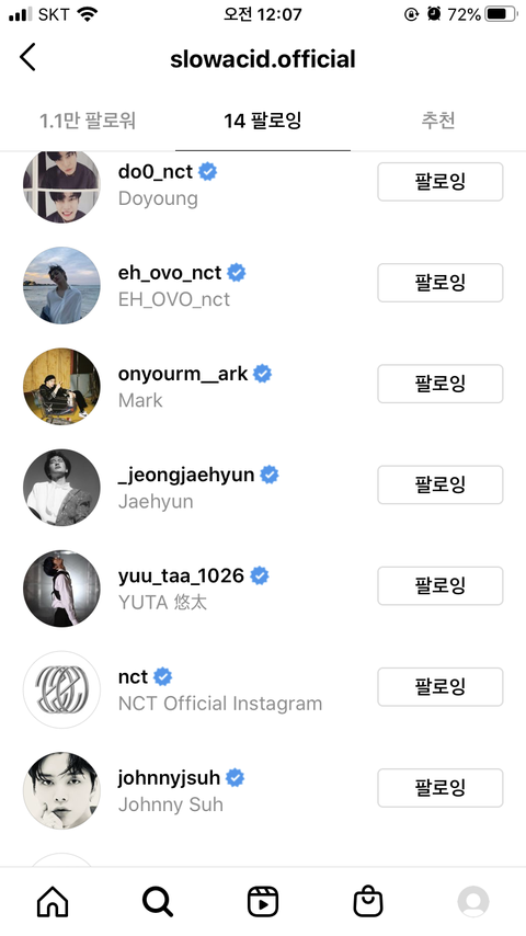 슬로우애시드라는 옷 브랜드에서 127멤버들 인스타 팔로우했어 대박