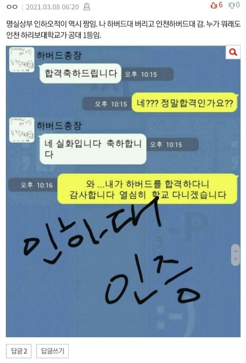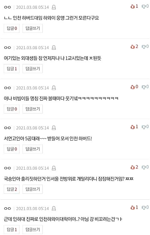 2. 인하대: 인하대를 인천하버드대고 부르며 인하 공대의 전통과 역사를 비하했음
