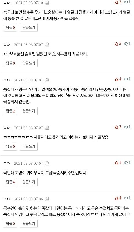 좌표찍고 몰려와서 숙읍대 찬양글 베플로 올려버리고 그 안에서 별로 입결 차이도 나지않는 국숭을 저렇게 깔 정도면 얼마나 발전이 없었던거지