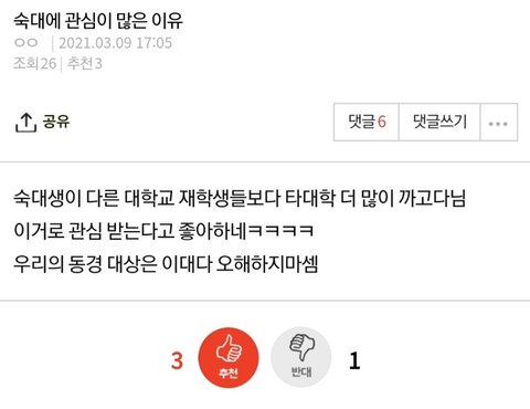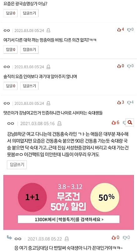 강남여고 친구가 팩트 발언을 날림→이걸 본 숙대로 추정되는 재학생들이 강남여고 재학생 댓글에 악의적인 의도로 반대테러와 숙대 아웃풋과 인풋을 내새우며 강남여고 학생을 몰아가기 시작함