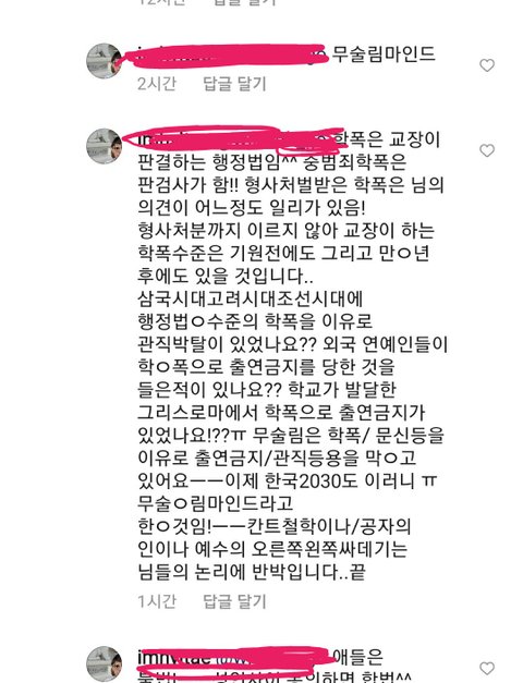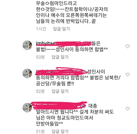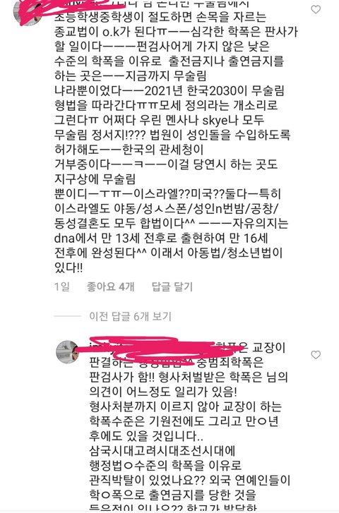 인스타를 살펴보다가정말 이해할 수 없는 댓글을 읽었습니다인기게시글이었으니 아마 보신 분도 있지 않을까 싶은데요...너무 어이가 없어서 계속해서 반박하다가 그냥 관두려고 댓글을 전부 지웠습니다.이런 인간한테 내 관심과 신경을 쏟는 게 아까워서요.그런데 이 사람이 뭐라고 했는지 짐작이라도 가시나요?N번방 사건이 이스라엘에서는 합법이라고 하더군요ㅋㅋㅋ 제가 너무 어이가 없어서 제대로 알고 말하라고 했더니 성인끼리 동의하면 합법이라고 하데요.ㅅㅈ의 학폭관련 글에 달린 댓글이며, 이 사람의 요지는 ㅅㅈ처럼 학창시절 학폭을 했다는 이유로 출연금지 당하는건 무슬림에서나 있는 일이라는 겁니다. 말씨름하며 순간 제가 비상식적인 사람인줄 알았습니다. 사진 보고 이 사람이 과연 정상적인지 판단좀 해주세요ㅜㅜ이 사람의 개인적인 의견일수도 있긴 하지만 전 이 발상이 도무지 상식적이라고 생각되지 않아요. 이런 댓글에 반박하는건 시간낭비라는 사실은 잘 알고 있습니다만...어이가 없어서 글 씁니다.