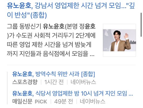 방역 수칙 안 지키고 식당에 있다가 걸렸다고 기사 떴는데 저렇게 댓글 다는 애들은 일부로 유노윤호 맥이는 거임?? 유노윤호처럼 바르게 살았으면 막 안 지켜도 돼??