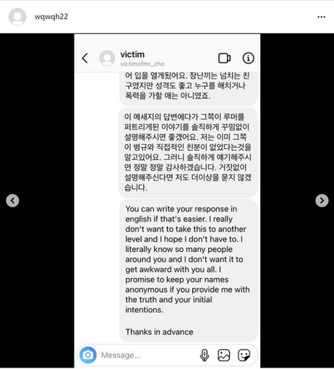 근데 학폭 피해자면 당연히 친분이 없겠지 ㅋㅋㅋㅋ 가해자 피해자 사이에 친분이 있으면 그게 더 웃긴걸.. 그리고 지인이면 지인 누구라고도 개인적으로 피해자에게 꼭 밝히셈 왜 대중에게 공개는 익명으로 하는거 이해해도 왜 피해자한테 실명 아이디로 얘기를 못함...? 소속사랑 무관해도 익명으로 여자친구한테까지 보내는게 진짜 소름끼친다