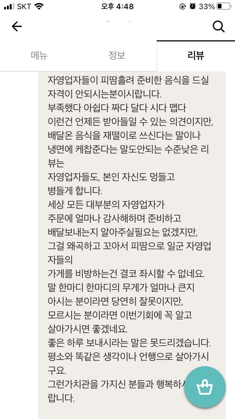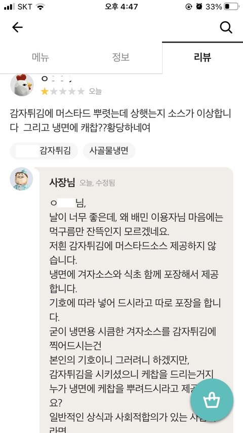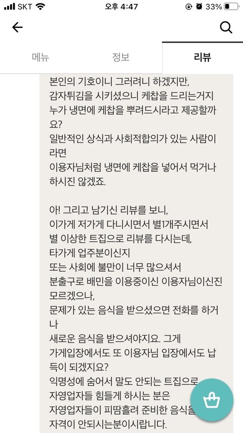 오늘 가게 리뷰에 당황스러운 리뷰가 올라와 혼자 속앓이 하다가