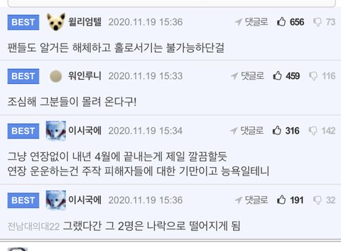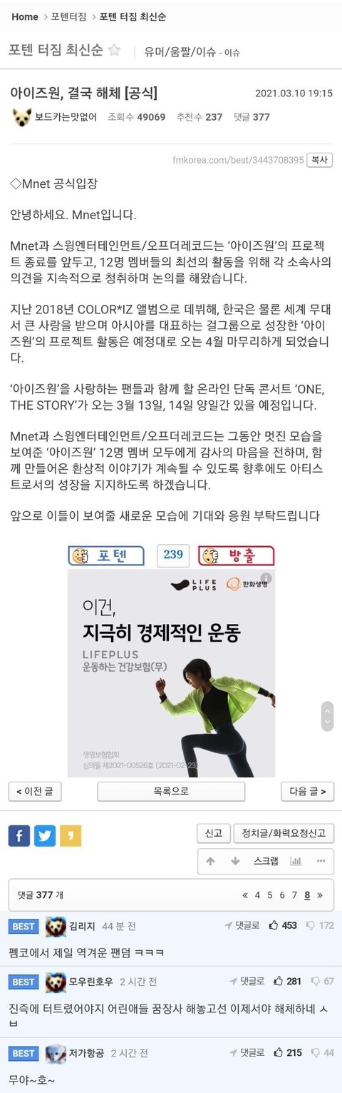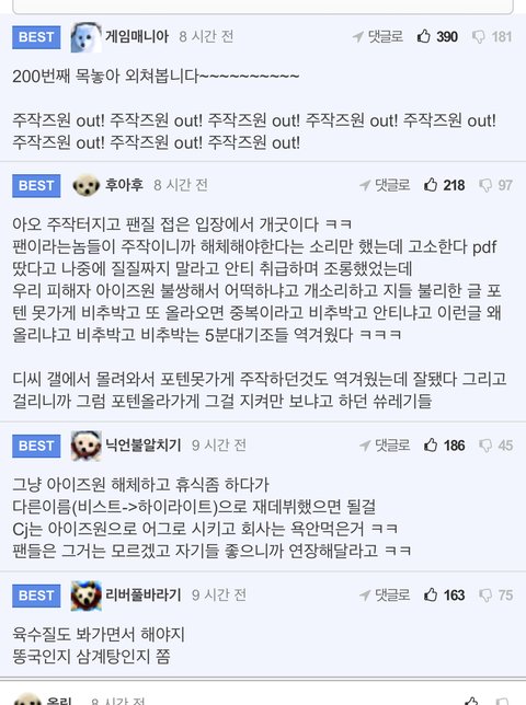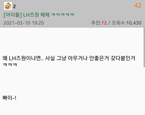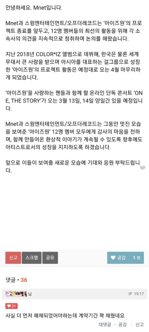 아이즈원 반응은 더쿠년들이 제일 극혐인듯 ㅋㅋ 아이즈원 까는 사이트 하면 판 떠오르긴 하는데 그나마 판은 해체 아쉽다는 애들도 있고 팬도 꽤 있긴 한데 더쿠년들은 ㄹㅇ 아직도 욕하고있던데 ㅋㅋㅋ