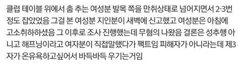 밀폐된 공간도 아니였고 온유테이블 위에서 춤추던 여자의 다리를 온유가 넘어지면서 잡았고 신고자는 여자의 지인 당사자가 아니였음 . 온유 경찰서로가면서 목격자들도 진술 .여자도 해프닝이라고 고소취하 했지만 채널에이가 속보로 전하고 성추행신고는 합의상관없이 검찰조사로 들어가서 검찰조사 다시 함 성추행으로 볼수없는 고의성 없음으로 무혐의 씨씨티비며 목격자진술로도 고의성없음이 분명한대 온유가 얼마나 싫으면 모른척 이 글쓰며 애 죽도록 욕먹는거 음흉하게 즐기는 글쓰니가 참 안타까울뿐 온유악개?온유악개있겠지. 근데 멤버 인장달고 온유 재기하라고 동영상만드는 미친ㄴ들과 악담하는 애들은 왜 가만히 보고있냐? 걔네들은 악개가 아니야?툭하면 어 온유 성추행 웅앵웅하면서 덧글달면서 온유 좋아하는것자체가문제있다는식으로 깨어있는 척하는거 진짜 소름돋아 어차피 니네 는 사건 파악을 제대로 안하잖아 그냥 온유.성추행범 이 프레임 계속 쓰고 싶은거지
