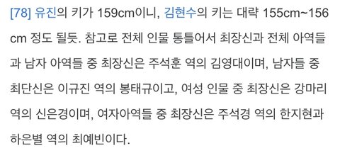4. 갑자기 유진 얘기하다 생각난 오윤희 딸 배로나(배우 김현수)도 156임. (원래 신체에 156이라고 써있었는데 프로필에서 사라졌더라.. 그래서 나무위키로 대체함ㅋㅋ..)