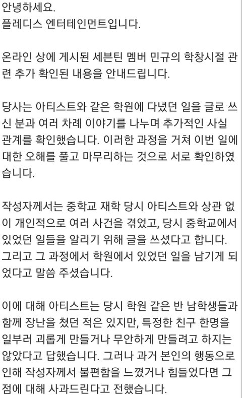 결국에 맞는 내용은 나대지마라는 뉘앙스의 말을 한 것 맞지만 괴롭힘의 목적은 아니었고 장난이었다 그렇지만 글쓴분이 그러한 말로 상처를 입으셨다면 사과드린다 이거밖에 없네 글쓴분이 애초에 정신적으로 힘드셔서 더 강하게 받아들이셨을수는 있는데 그 이외의 내용이 정확한 사실이 아님에도 불구하고 글을 쓰신 것 자체가 사실 플디에서 고소 충분히 할 수 있는데 안 한 건 그 분을 배려해서도 있고 그냥 조용히 넘기고 싶은 부분도 있는 것 같음 뭔가 점점 하나씩 밝혀질수록 민규의 학폭은 점점 신뢰도가 떨어지는 건 맞음 그리고 뭐 돈 먹였다 ㅇㅈㄹ하는데 애초에 돈 먹일거면 진작 연락했겠죠 .. 피해자분이라 주장하신분들의 연락을 기다린다고 1차 입장문에도 써놨고, 이번 입장문과 관련된 글쓴분이 플디랑 컨택할 예정이라고 마지막으로 올린 글에 써놨음 이것만 봐도 .. 돈 먹이고 끝낼 생각이 없었던 걸로 보임 ㅇㅇ