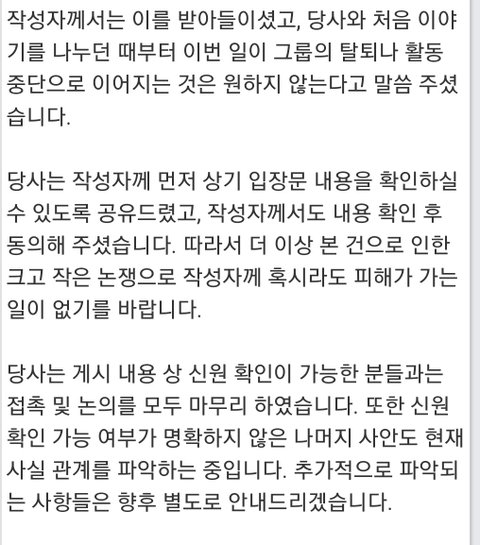 플레디스 입장문 내기까지 시간은 엄청 걸리지만 그런 만큼 조목조목 잘 따져서 쓰는 듯.. 이게 바로 억울한 사람 없이 잘 풀어가는 입장문이지 난 기억이 안나용 이런 거 말고..