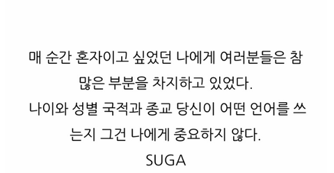 이건 올팬 아미들끼리도 잘 얘기하는건데 인기순위 뭐 이딴게 아니라 그룹의 정체성을 두고 따지면 방탄의 정체성은 슈가임. 악개 이런게 아니라 방탄 멤버 전원을 합치고 방탄소년단 성장 서사를 합친게 슈가고 방탄 화양연화를 의인화한게 슈가임. 그냥 슈가의 인생이 방탄 멤버 전원의 성장서사를 담은 것 같음. 뭐 사실 방탄은 7명 전원이 그룹의 한 부분씩 담당하고 있으니 누구 하나를 꼽을 순 없지만 정체성은 슈가.