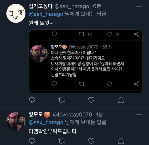 왜 dm을 보래? 뭐 해명이라도 하게? 할거면 공개로 해 ㅈㅂ