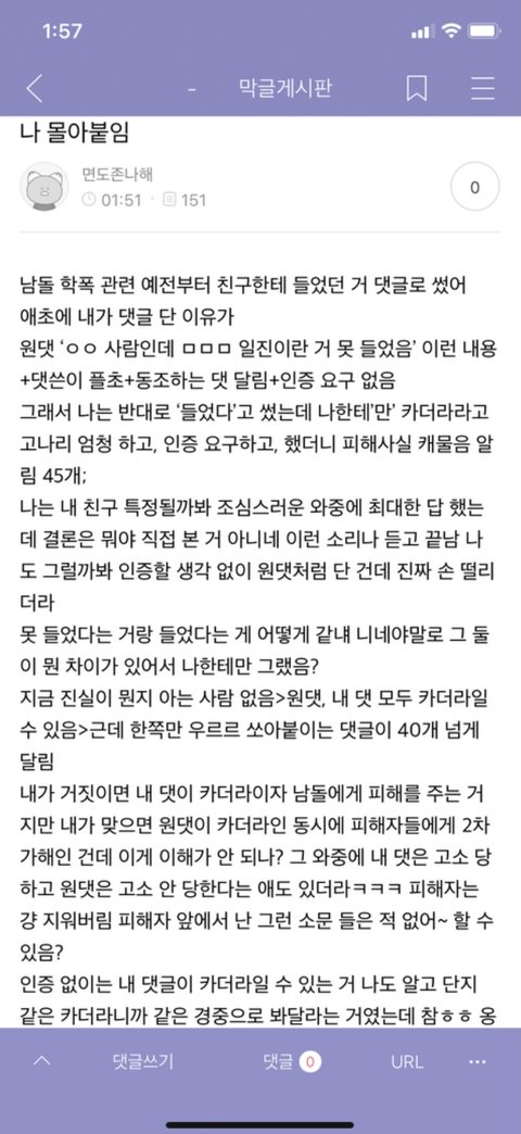초반에 학폭글 터지고 자기 들은게 있다 인증 하나없이 내 친구들한테 들었다고 뻑뻑우기다가