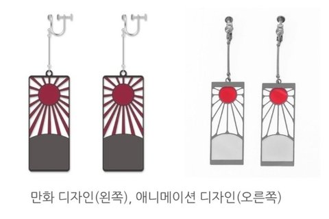 뭐 생각않나? 욱일기잖아,, 아래 사진 보면 두개가 다르지? 만화 귀걸이가 문제가 되서 애니버전에선 수정한거야