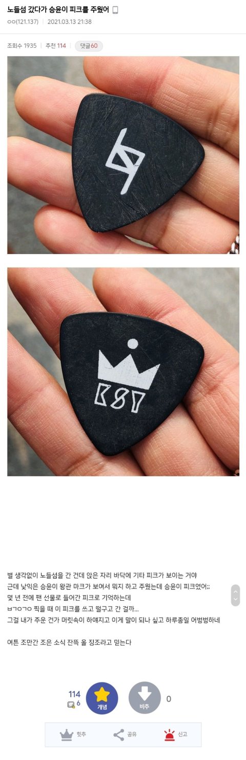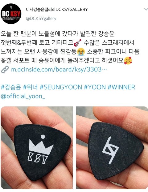 위너 강승윤이 최근에 노들섬에서 비긴어게인 오픈마이크 촬영했는데 촬영할때 쓰고 사이즈가 조그맣다보니 정리하다가 떨어진걸로 추정되는 기타 피크를 팬이 우연히 그 장소 그 자리에 갔다가 주움ㅋㅋㅋㅋㅋ 마침 팬분들이 서폿해준거라하고 피크를 발견한 팬은 다시 돌려주길원한다고...5년전에 선물 준건데 여전히 잘 쓰고 있었고 스크래치만 봐도 사용감이 느껴져서 팬들은 감동받음!!