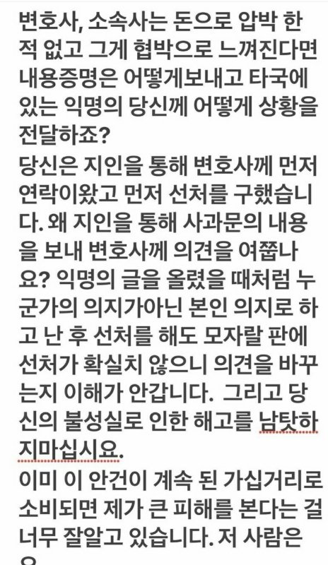 폭로자는 분명 변호사 쪽에서 먼저 a한테 협박(?)했다했음.근데 a는 폭로자에게 사진을 제공해준사람이라 변호사와 접촉할 일이 없는데 어떻게 먼저 연락했고 협박내용은 왜 까지 않는거고 앞에 모든게 구라라치고 선처를 먼저 요구했어도 왜 갑자기 처음에 변호사를 구한다면서 대응하겠다고 당당했던거와는 다르게선처를 요구한건가 그것도 본인이 아닌 a를 통해서