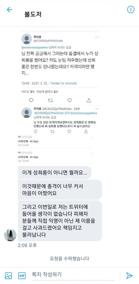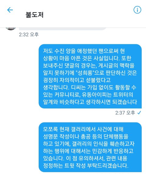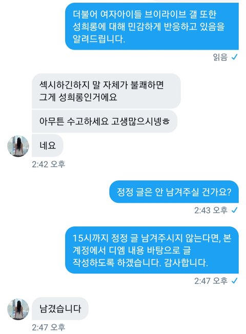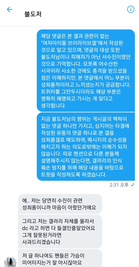 아이들갤에서 정정했는데 이건 안 올리시고 끝까지 여자아이들브이라이브갤에서 성희롱을 했다고 하시네요. 저 발언은 분탕 치려는 목적의 댓글일뿐더러 불도저님께 한 발언도 아닙니다.