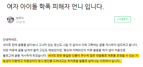 중요한 내용 알아보지도 않고 2차 가해, 시녀 소리, 악개 이제 안 듣습니다.시녀무새들은 보고 싶은 것만 보는 열등감에 쩔은 인간이라고 밖에 해석 못하겠습니다.