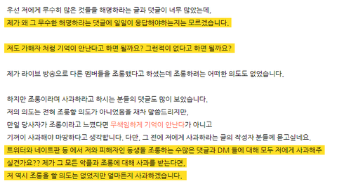 제가 그 악플들에 사과를 받는다면 저 역시 조롱할 의도가 없었지만 사과하겠습니다.