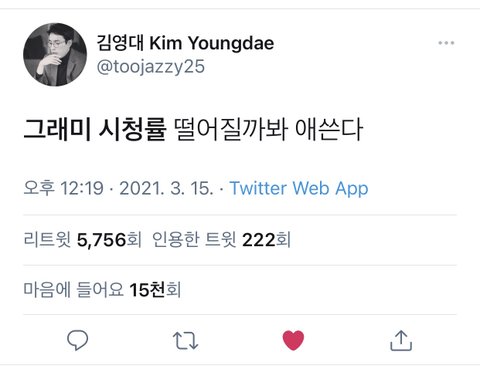 그래미 시청률 떡락했대ㅋㅋ 매년 상은 주지도 않을거면서 시상자 수상자 후보로 다양하게 어그로 끄는거 진짜 도독놈 심보도 아니고;; 방탄은 국적이 한국인게 약점이다 ㅅㅂ