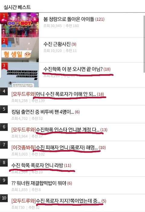 미친거지? 니네 언니 '기억 안난다' 발언으로 다 끝난거라니까? 폭로자 행동이 이상하다고 할게 아니라 니네 언니 행동 이상한거부터 지적해 그거 해결안되면 폭로자가 빤스만 입고 춤을 춰도 니넨 할말이 없는거야 영자는 이렇게 조직적으로 판 물 흐리는 것들 제재안함?