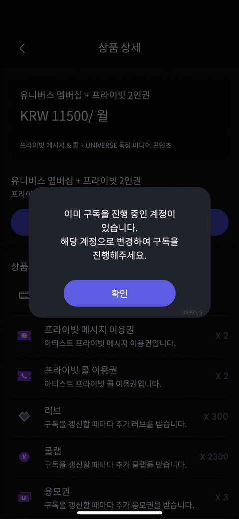 저번달에 2인권 쓰다가 끝나서 유니버스앱 지웠다가 어제 영훈이 프메보고 다시 결제하려고 깔았는데