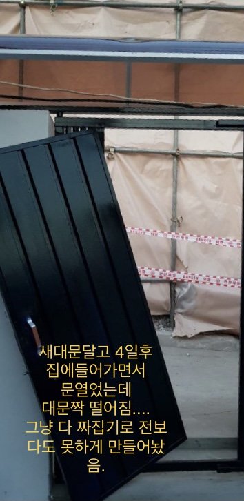 문제는 허물어진 집은 다시 원래대로 고쳐놔줘야 하는거잖아요.근데 일주일이면 고칠걸 지금 2주가 다되어가는데 원래대로는 커녕 자기네가 편한대로 멋대로 엉망으로 고쳐놓고,대문은 반대로 달아서 문도 안잠겨요,문을 못잠그니 당연히 밖에도 마음놓고 못나가구요.