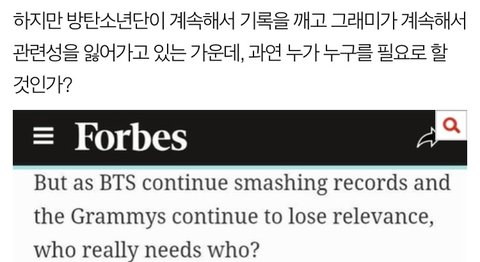 그리고 밑에는 판글인 포브스기사 지금 당장 네이버에 방탄소년단 그래미 쳐봐 방탄소년단 그래미불발 그래미수상실패 이딴제목인 글뿐일걸? 근데 정작 해외 외신사인 포브스 기사봐 성적으로 두고보면 누가 누구를 필요할 상황인지. 지극히 개인적인 의견이지만 그래미가 무조건 방탄을 필요로 해야한다는건 아니야 근데 그래미가 하는 행동을 보면 이건 좀 아니라는거야. 이 말들이 방까들한텐 한귀로 듣고 한귀로 흘리는 개소리같이 들리겠지만 결국은 니네가 틀린거야 적당히해 ㅋㅋㅋㅋ