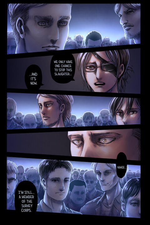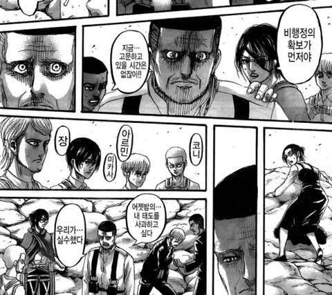 마가트 원수 눈빛이 아끼는 제자 가비를 향하고 악마로 여겼던 파라디 섬 조사병단에게 진심으로 사과하고 도움을 요청하는 컷