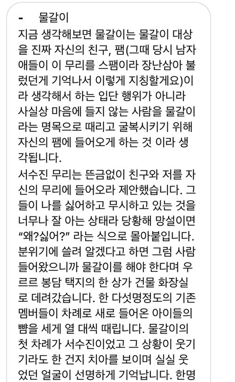 1. 피해자 A 와 B 모두 수진에게 뺨을 맞았으며 그것은 물갈이라고 하는 스팸의 입단 신고식이었다.