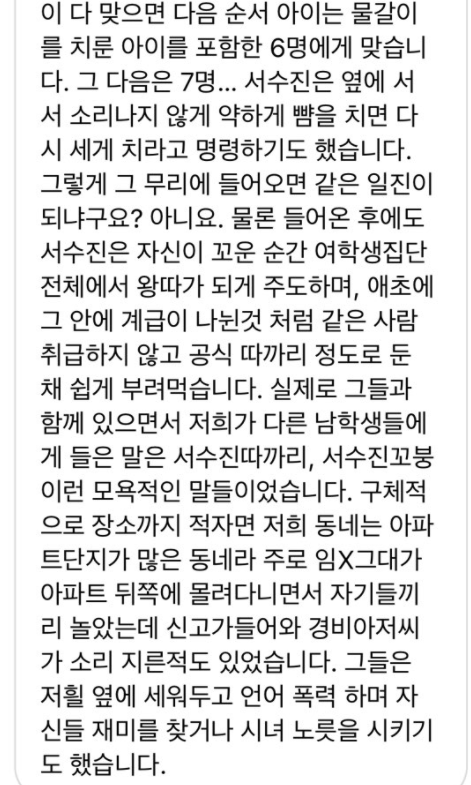 "*** 이제부터 왕따"라는 식으로 돌렸고저는 너무 무서워서 문자를 지워달라고 전화해서 계속 빌기만 했습니다.------------------------------------------------------