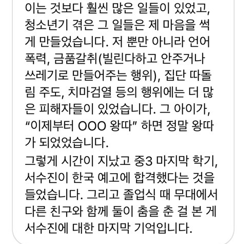 - 두 피해자 모두 서수진이 ㅇㅇㅇ왕따라고 하면 왕따가되었다는 진술을 했는데. 이 진술이 모호함. 피해자 A가 말한 정황을보면 이 왕따라고하는게 무리내부에서 도태시킨다는 개념으로 보이는데 피해자 B가 두루뭉술하게 얘기해둔걸보면 여학생 집단전체 또는 다수로부터의 왕따로보임 (폭로자도 단체문자라고 지칭). 그런데 서수진이 권력처럼 사용했다는 "이제부터 ㅇㅇㅇ왕따"이걸 피해자 A의 말을 들어보면 문자로 보내는식이었는데 과연 피해자들 말처럼 권력의 도구나 협박용으로 사용했다면 가장 결정적인 물증이 될 문자가 왜 하나도 나오지 않았는지가 의문. 실제로 저렇게 권력으로써의 효과가 있으려면 다수에게 여러번 문자를 했을테고 그게 협박처럼 사용되었다면 분명 저장 기록해두거나 최소한 그 기기가 남아있는 몇몇은 있을텐데 유일한 물증이 될 수 있는 이 문자가 안나옴. 정확한 정보는 모르지만 폭로자언니는 이 문자 복구가 안된다고 했다고 함.