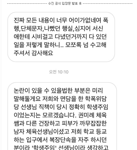 물론 폭로자언니의 폭로글 내용상으로는 물갈이의 피해자가 피해자 A,B외에도 또 있고 본인에게 제보를 했다고 써놨음. 하지만 현재까지 저 무리내부적인 폭행 내용에 대해서는 두 명이 일치하는 진술을 했고 외부에서는 알 수 없다고 말하고 있음. (무리외부 동창의 증언은 불가하다는 뜻 다른말로는 지금까지 무리 관련해서 폭로한 사람은 무리의 사람이라는뜻)