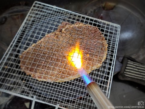 하지만 아파트에서 숯불 화로를 놓을 방법은 없으니 아쉬운대로 석쇠에 고기를 끼우고 가스 토치로 지져가며 굽습니다.