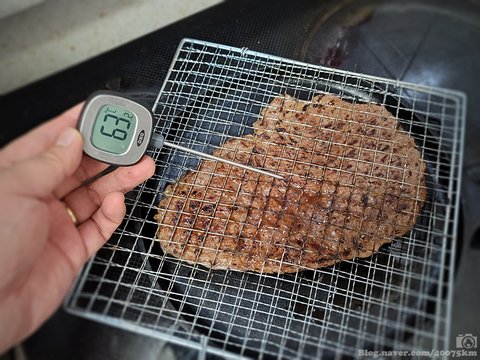 취향에 맞게 앞뒤로 뒤집어가며 구워줍니다. 이번에는 미디움에서 미디움 웰던 정도 되는 63도에 온도를 맞췄습니다.