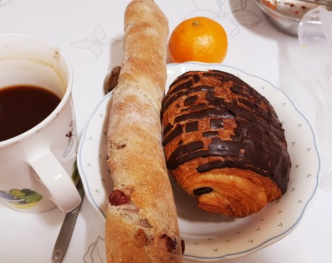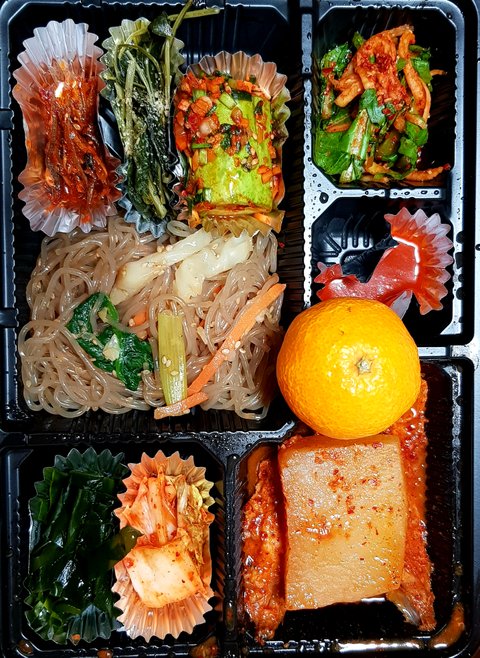 나는 고등어조림 두동가리 잡채 멸치볶음 각종 나물무침 오이소박이 김치 곰피미역 귤 아욱된장국 우유 and 브래드&티