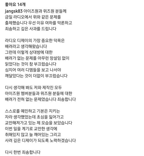 발언자체는 문제가 없고 저런 디엠보낸것도 잘못이지만 방송을 보면 알겟지만 의도가 어땟는지 모르지만 굉장히 조롱하듯이한거 자체는 장성규 잘못은 맞다고 볼수잇지않을까 게다가 앚이랑 앚팬덤이 선넘규라는 캐릭터를 만들어줘서 승승장구햇고 그걸 본인이 인정하고 고맙다는 인스타까지 올렷엇으니 본인도 프듀 ㅈㅈ의 간접적인 혜택을 받앗다고 볼수잇는데 그 장본인이 그랫으니 앚퀴든 뭐든 기분이 나쁠수는 잇다고 생각해~