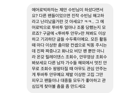 인스타 아이디 @subinnnkim 투바투 담당 안무가아이딘데 디엠으로 ⭕️무례하지않게⭕️ 투바투 안무에 대해 건의 좀 해주라.. 솔직히 투바투 안무 애들 힘든거 많고 애들이 힘든거에 비해 화제 되는 것도 없잖아.. 다른 남돌들 안무로 릴댄이나 직캠 조회수 팍팍 오를 때 투바투는 안그래서 진짜 속상해.. 그리고 팬들 경악시켰던 에어로빅도 이 안무가가 재밌다고 제안한거야 투바투 개그맨 아니고 2년차 남돌이야ㅠㅠ 제발 더 이상한 춤 안만들게 같이 디엠 좀 보내주라 이건 다른 사람들이 보낸거..