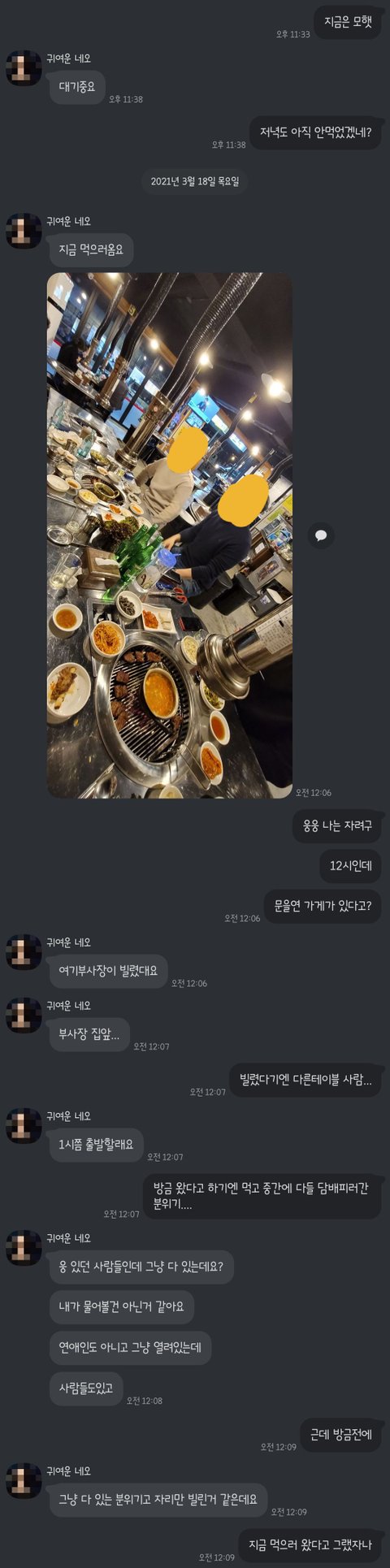 그래서 알겠다 했고 밥은먹었는지 뭐하고 있는지 물어봤더니 11시가 넘은 시간에 고깃집에서 찍은 사진을 보내주더라구요