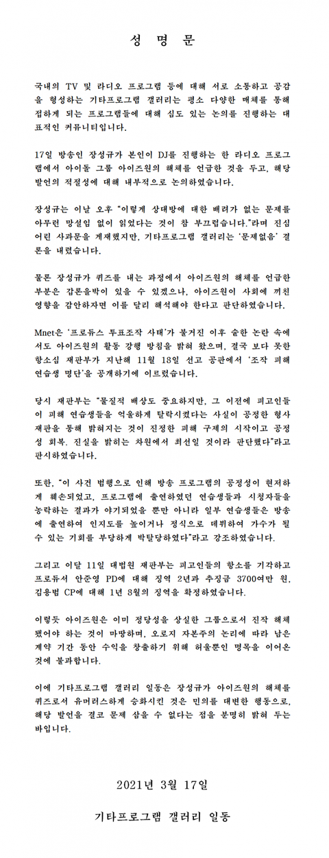 이에 기타프로그램 갤러리 일동은 장성규가 아이즈원의 해체를 퀴즈로서 유머러스하게 승화시킨 것은 민의를 대변한 행동으로, 해당 발언을 결코 문제 삼을 수 없다는 점을 분명히 밝혀 두는 바입니다.