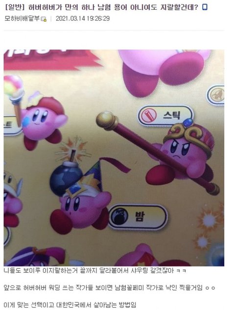 첨에 뻑가가 허버허버 여혐이라고 지랄한 거 아님??? 저거 때문에 사실 확인도 없이 내려진 임티 작가들은 걔한테 고소 좀 했음 좋겟닼ㅋㅋㅋㅋㅋㅋ