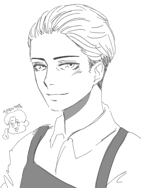 ㅎㅇㅎㅇ 하도 그림 많이 올려서 다들 알 듯 이번엔 찻집사장 리바이를 그려봤다 머리 쌔끈하게 까보았다... 다음엔 에렌이랑 쟝 그려볼라고