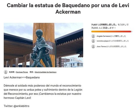 칠레에 과거 원주민을 학살한 개새1끼의 동상이 영웅이랍시고 세워져있는데 그걸 뿌시고 다른걸로 바꾸려고 하니 아직 마땅한 게 없어서 리바이 동상이라도 세워두는게 어떠냐고 서명운동을 했는데 7만5천명이 동의했다곸ㅋㅋㅋ