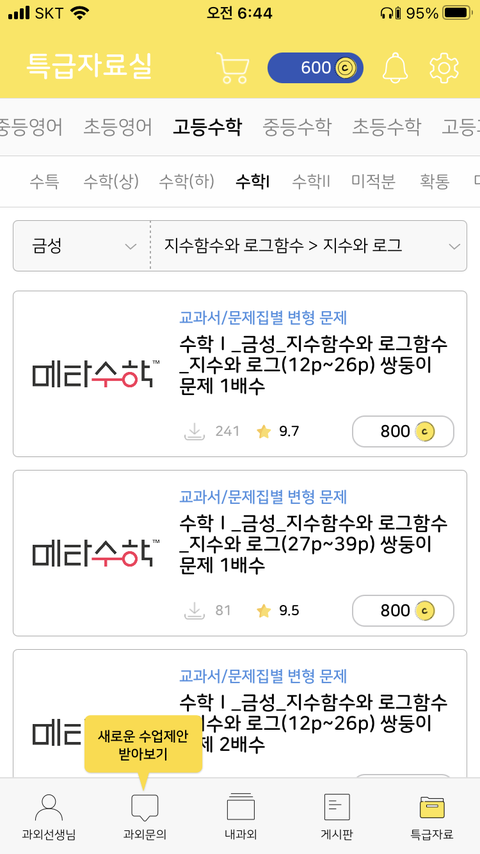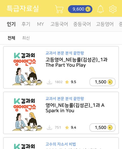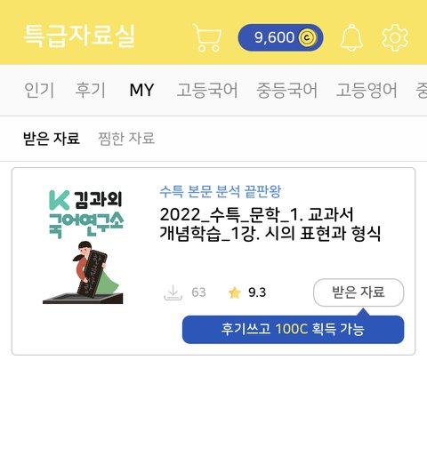 먼저 저는 김과외 앱은 특급자료실이 포인트라고 생각하는데 여기서 수특자료 , 영어본문자료 , 수학변형문제 +과학 등등이 있습니다 매일 출석할 때 포인트도 줘서 이걸로도 자료들을 구매할 수 있어요 (。・‧̫・。 ) 여기서 받을 수 있는 자료들은 초등학교~고등학교까지 전부 있어서 유용하게 쓸 수 있습니다